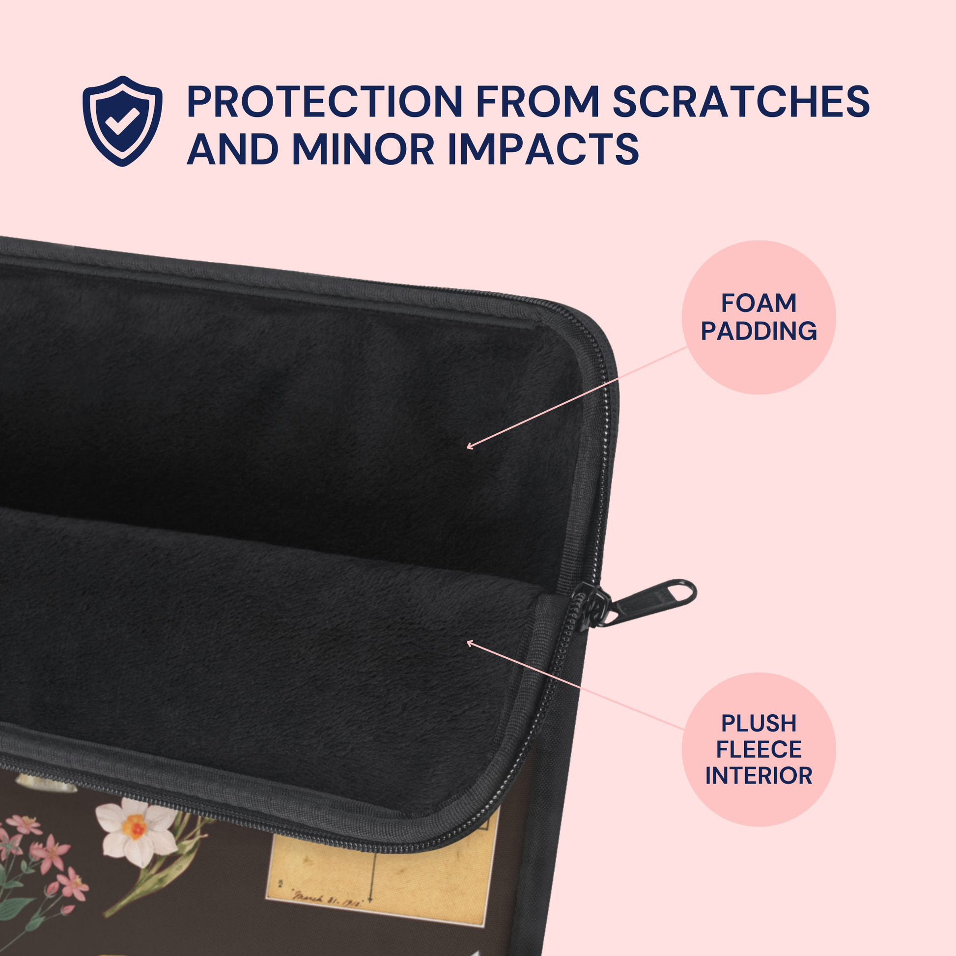 Carry your laptop with style! This high-quality sleeve is available in three sizes to protect your laptop from scratches and minor impacts. Printed on one side with a black backside, edging, and zip, it's an elegant and stylish companion from day to day.