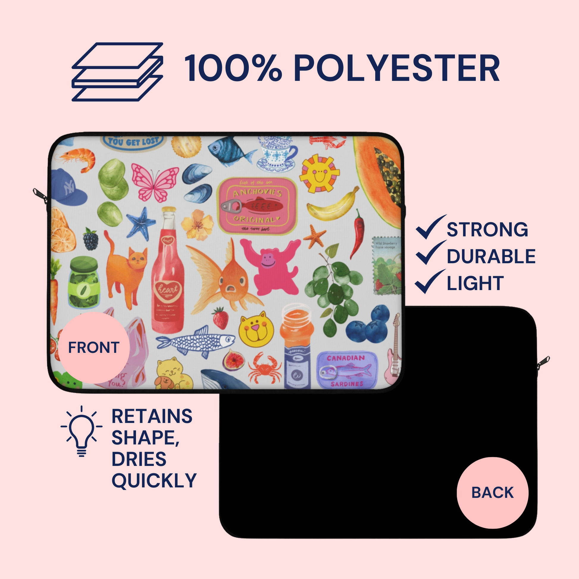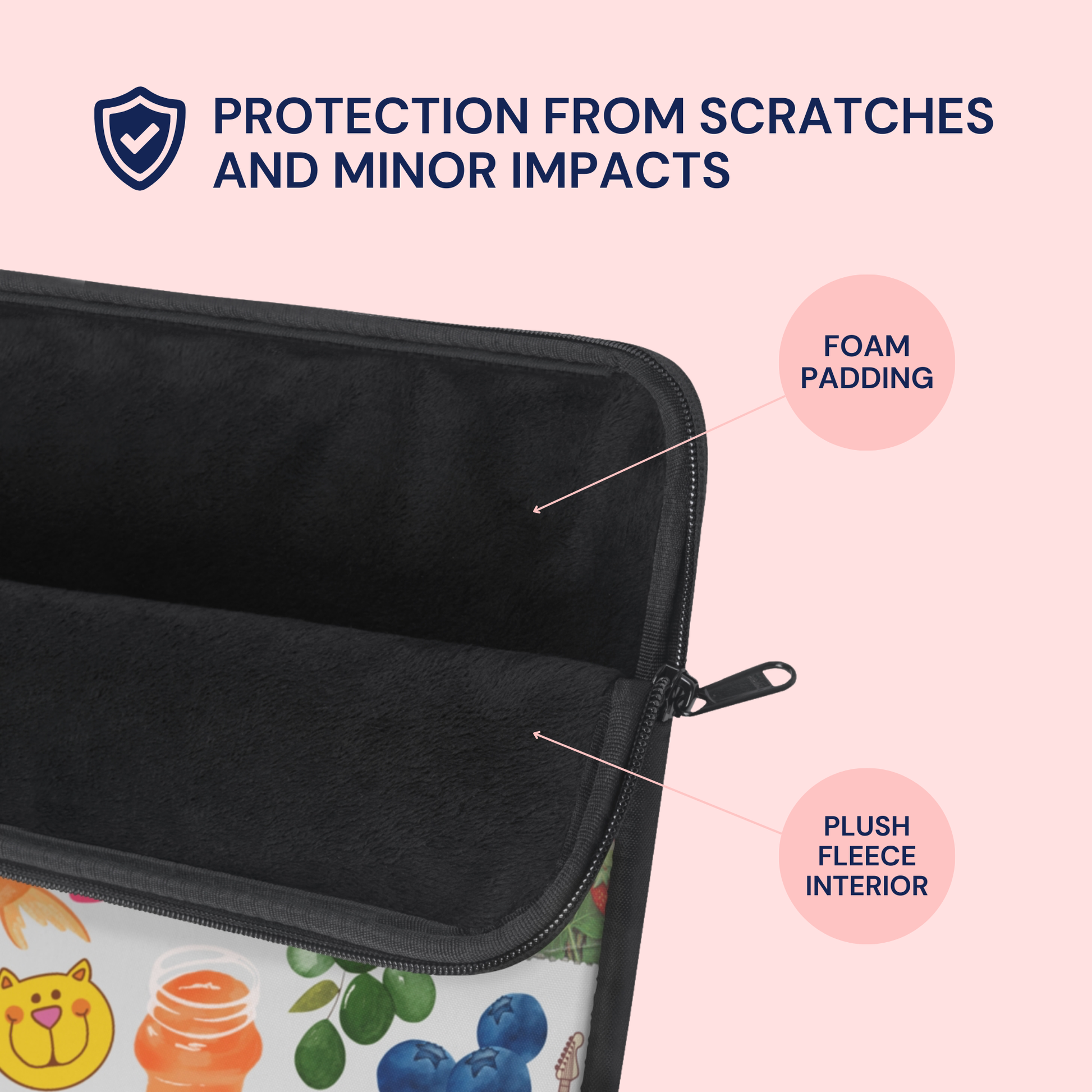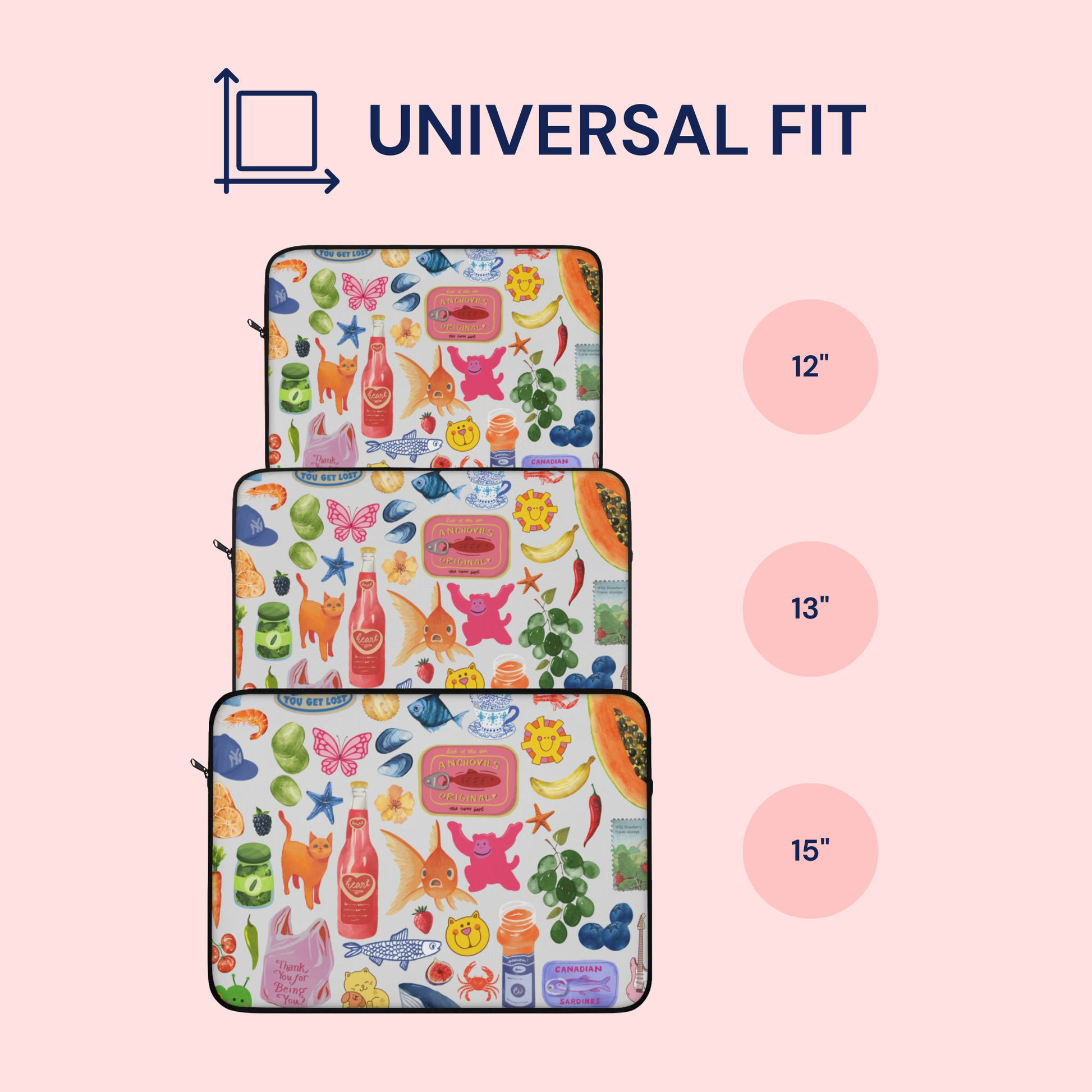 Carry your laptop with style! This high-quality sleeve is available in three sizes to protect your laptop from scratches and minor impacts. Printed on one side with a black backside, edging, and zip, it's an elegant and stylish companion from day to day.