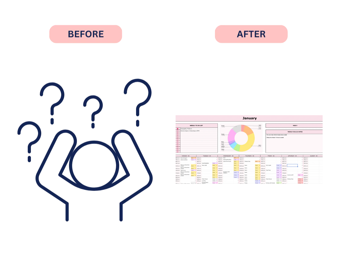 Transform your life from chaos to clarity with our Spreadsheet! Say goodbye to overwhelm and hello to productivity. Organize tasks, set goals, and achieve success with our intuitive interface. Declutter your mind, accomplish more, and unlock your full potential.