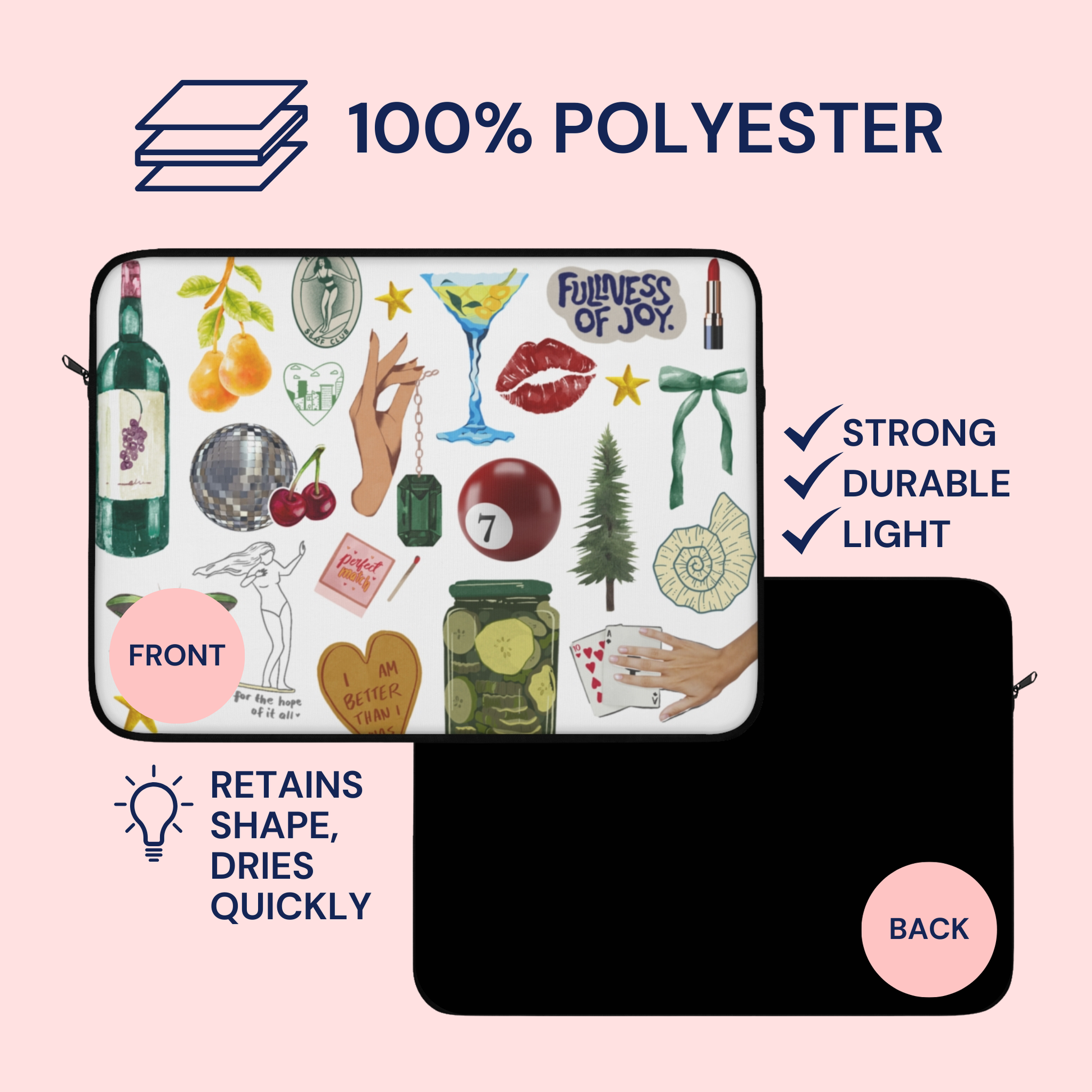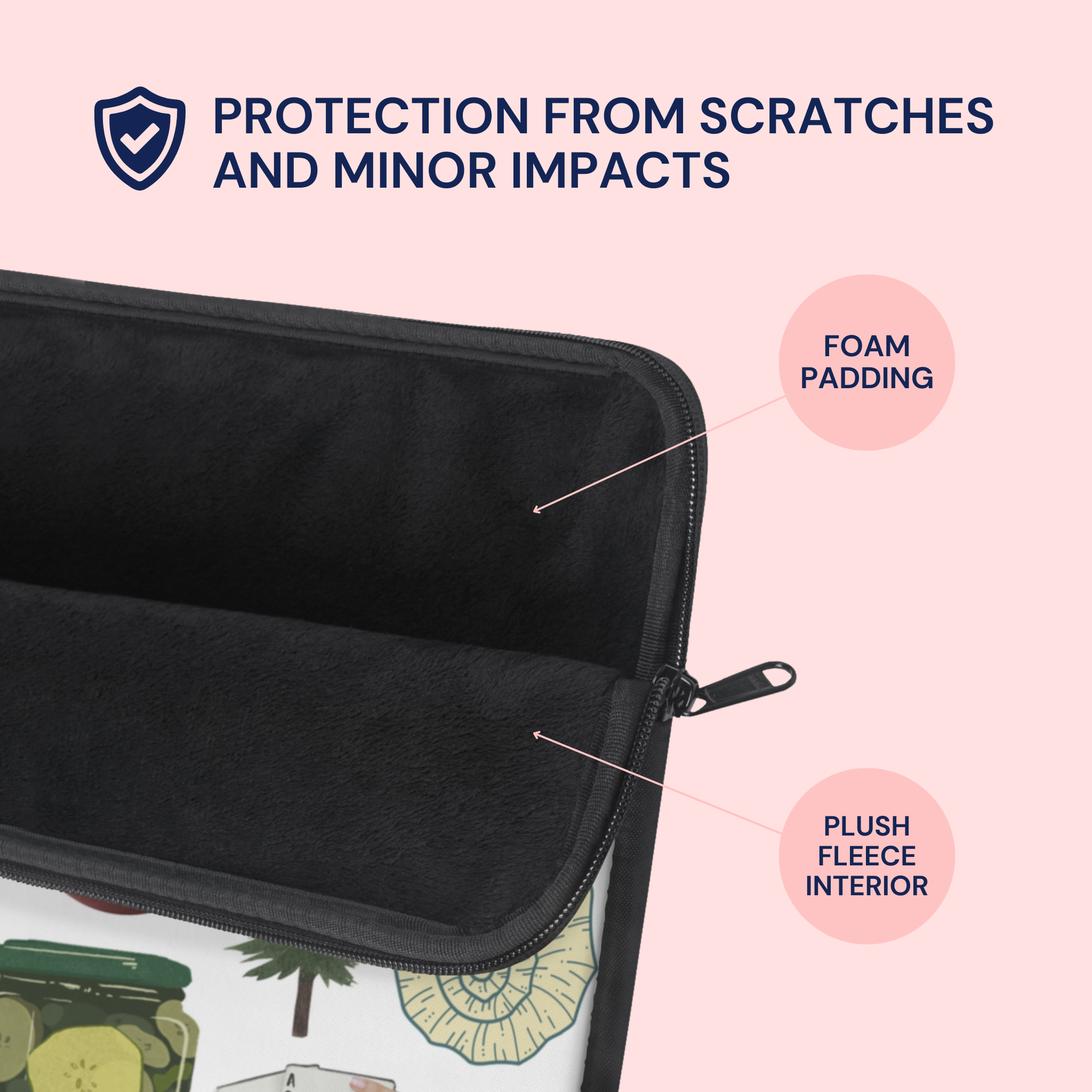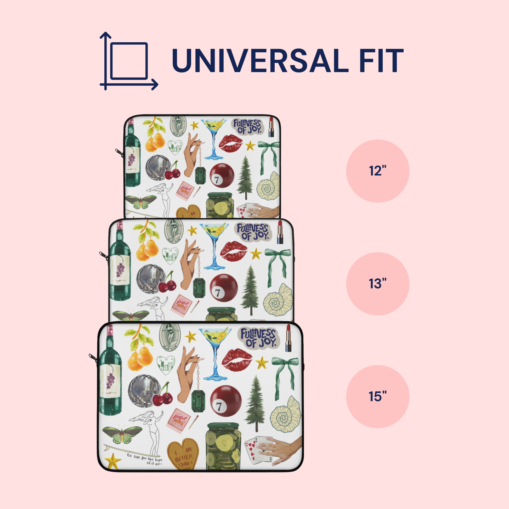 Carry your laptop with style! This high-quality sleeve is available in three sizes to protect your laptop from scratches and minor impacts. Printed on one side with a black backside, edging, and zip, it's an elegant and stylish companion from day to day.